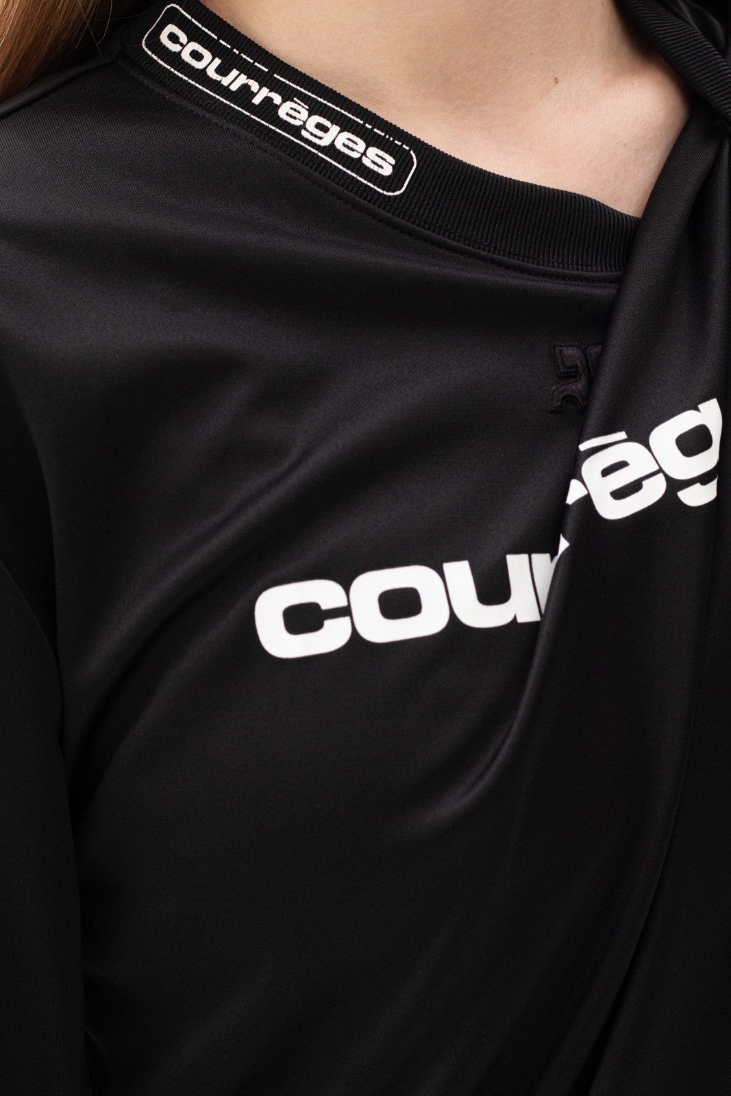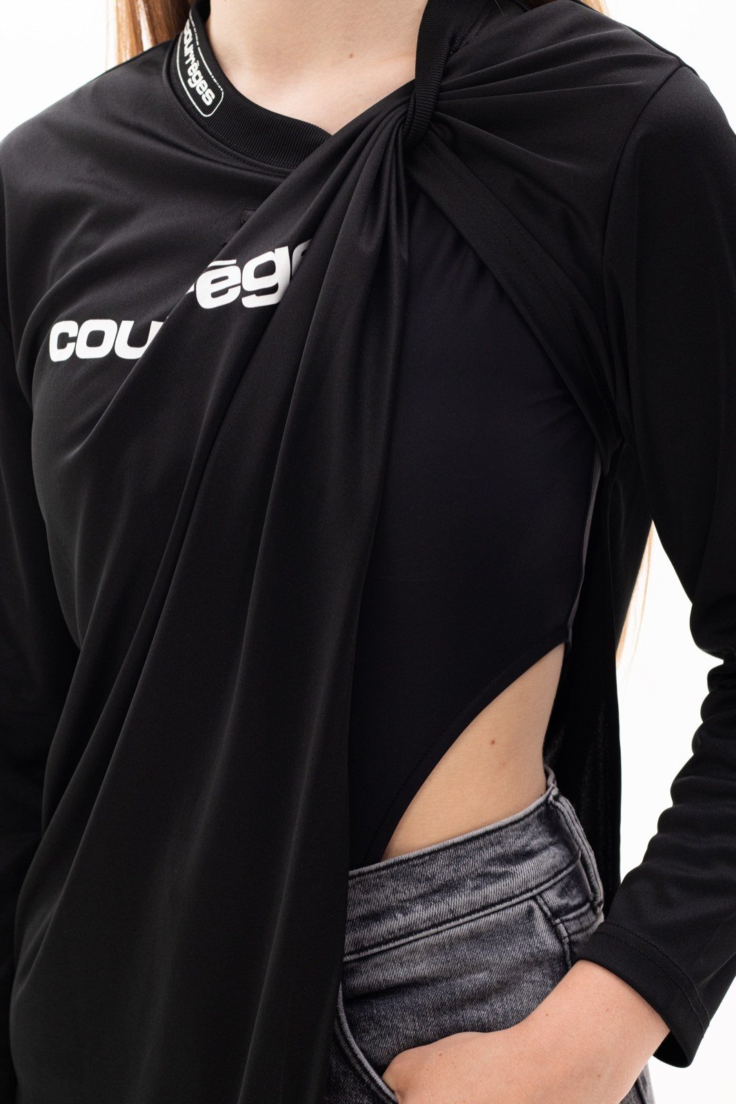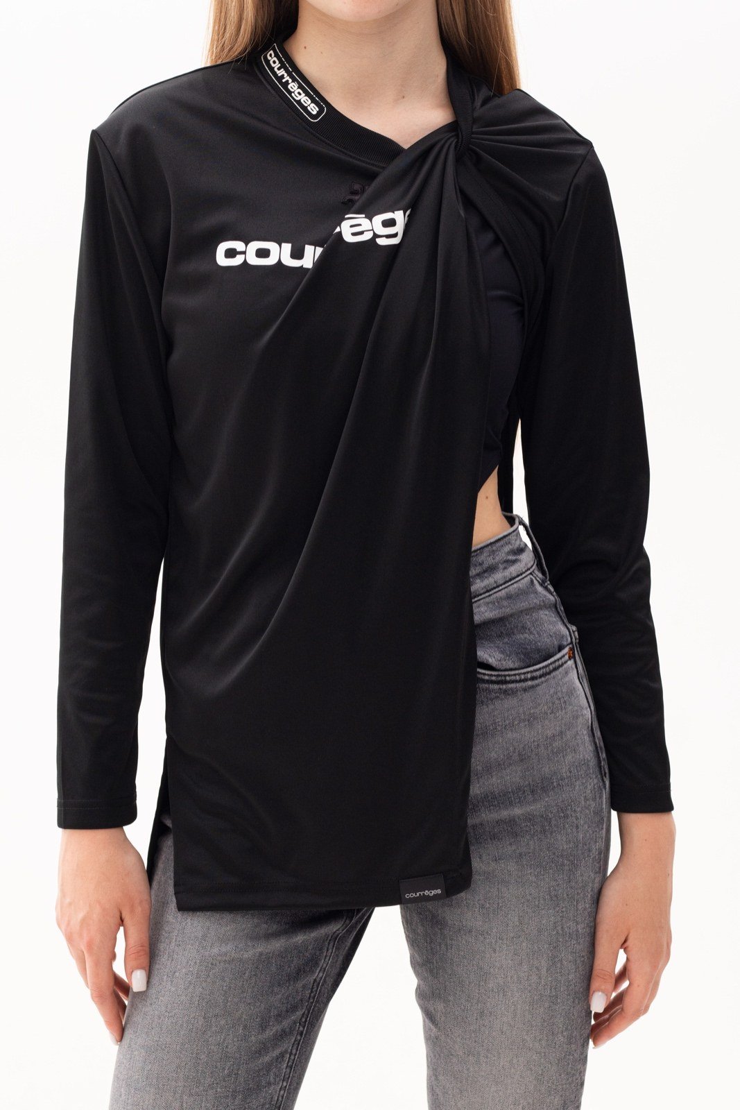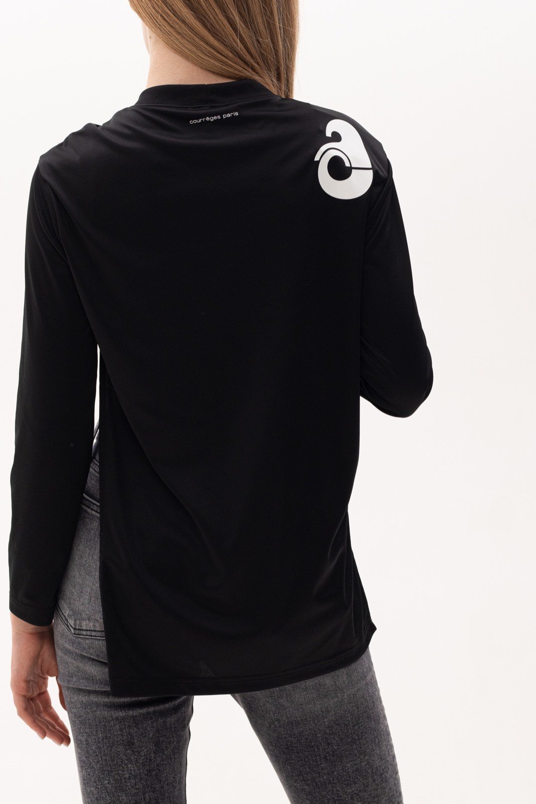Двухслойный материал, асимметричная форма, логотип спереди, круглый вырез, длинные рукава, прямое разделение и вырезные детали.
