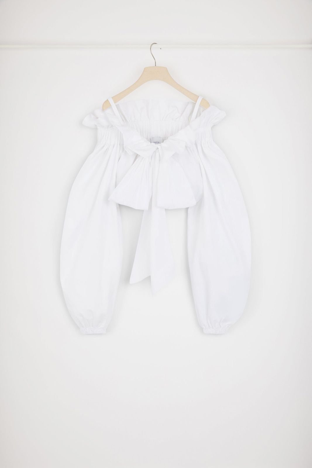 Белый экологически чистый хлопковый топ из поплина. Укороченный объемный силуэт, который можно носить с узлом на шее или без плеч. Воротник-кулиска с воланом спереди и длинными завязками в грош. Рукава летучая мышь с эластичными манжетами. Резинка на талии.