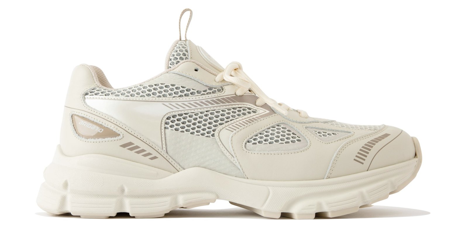 Кремово-белый, кожа, нашивка с логотипом сбоку, сетка, шнуровка спереди, нашивка с логотипом на язычке, петля для подтягивания на язычку , заостренный носок и массивная резиновая подошва.