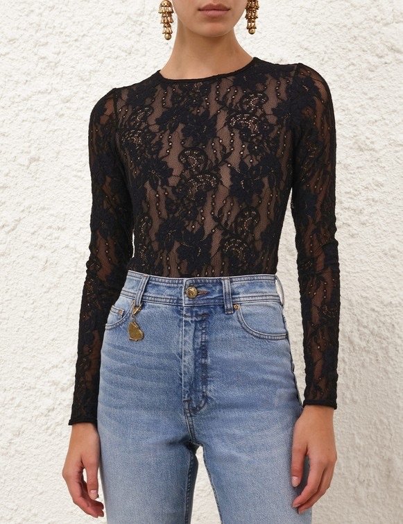 Черный кружевной боди из коллекции Hypnotic осень 2025 года. Этот кружевной боди имеет длинные рукава, круглый вырез горловины и сетчатую подкладку. ленты