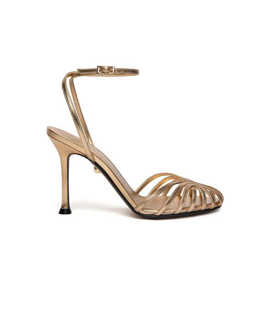 Лакованные босоножки в клетку с лакированным каблуком в тон. Тонкие полоски на носках и перекрещенный ремень на лодыжке с маленькой боковой пряжкой.
