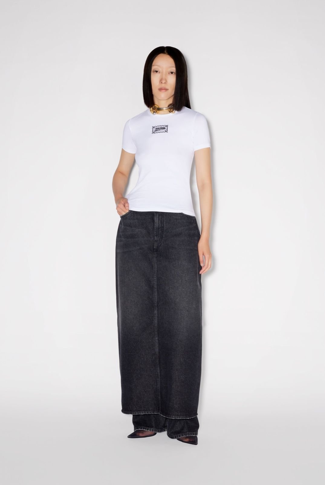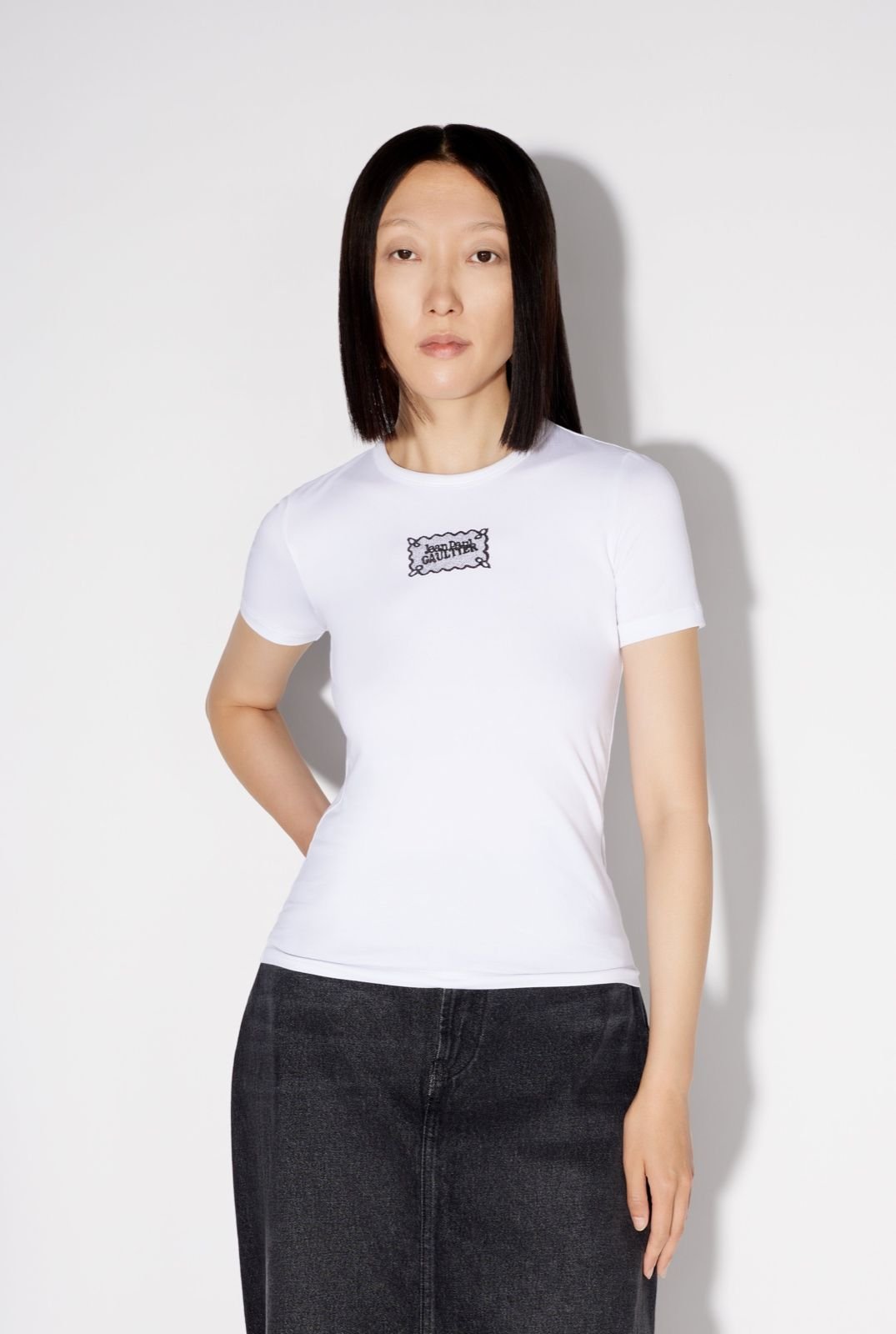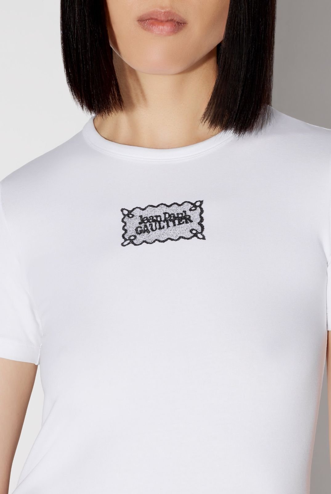 Белая хлопковая футболка с этикеткой Jean Paul Gaultier.