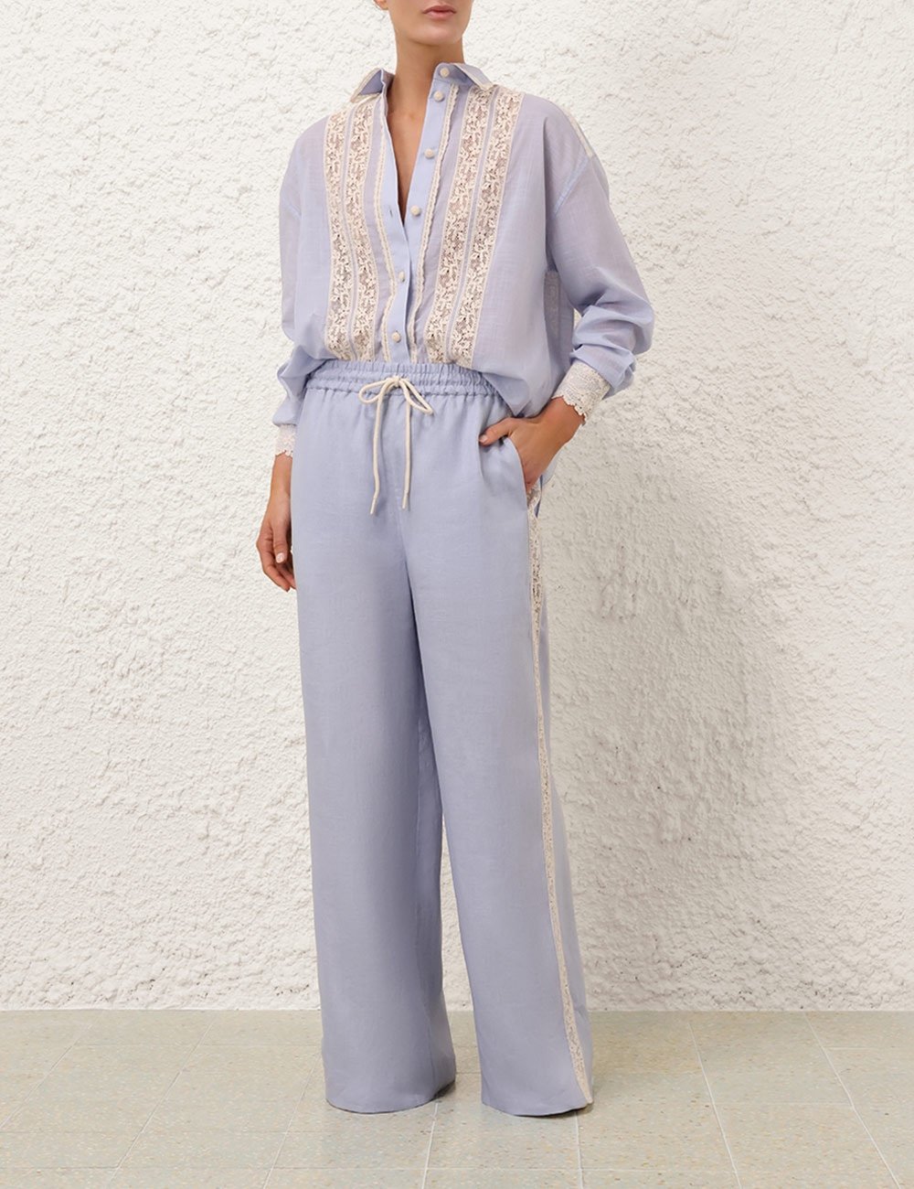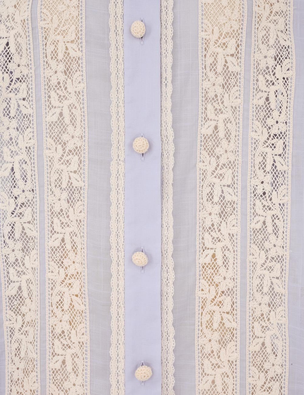 Костюм с кружевной отделкой Everley Dusty Blue из коллекции Resort Swim 2025. Хлопковая рубашка с воротником-мандарином, пуговицами по центру спереди и кружевной отделкой.