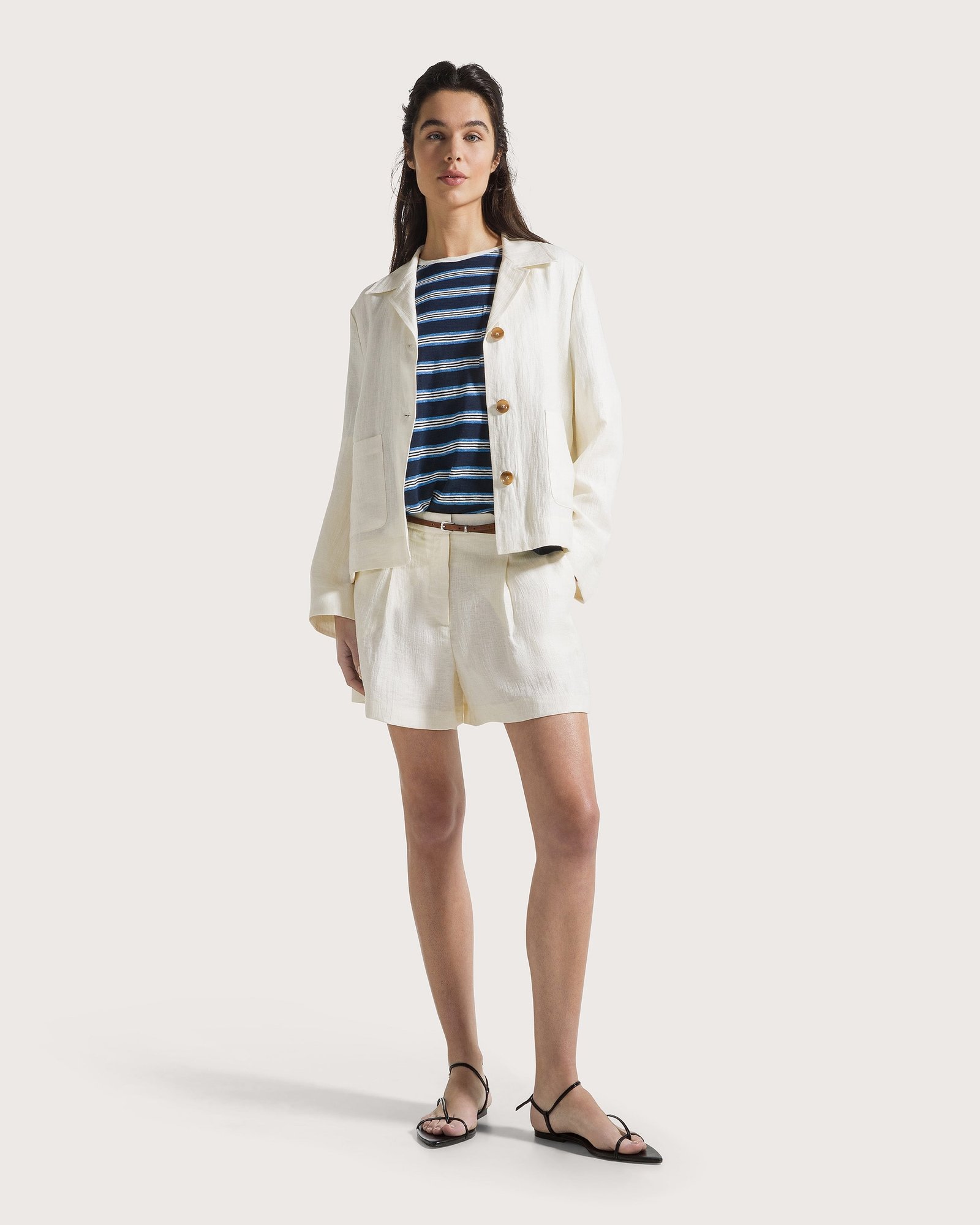 Шорты из мятой смешанной льняной ткани с застежкой на молнию и пуговицы, шлевками для ремня на талии, боковыми карманами и накладными карманами сзади.