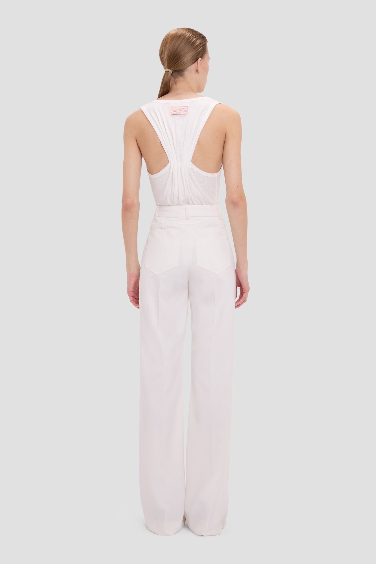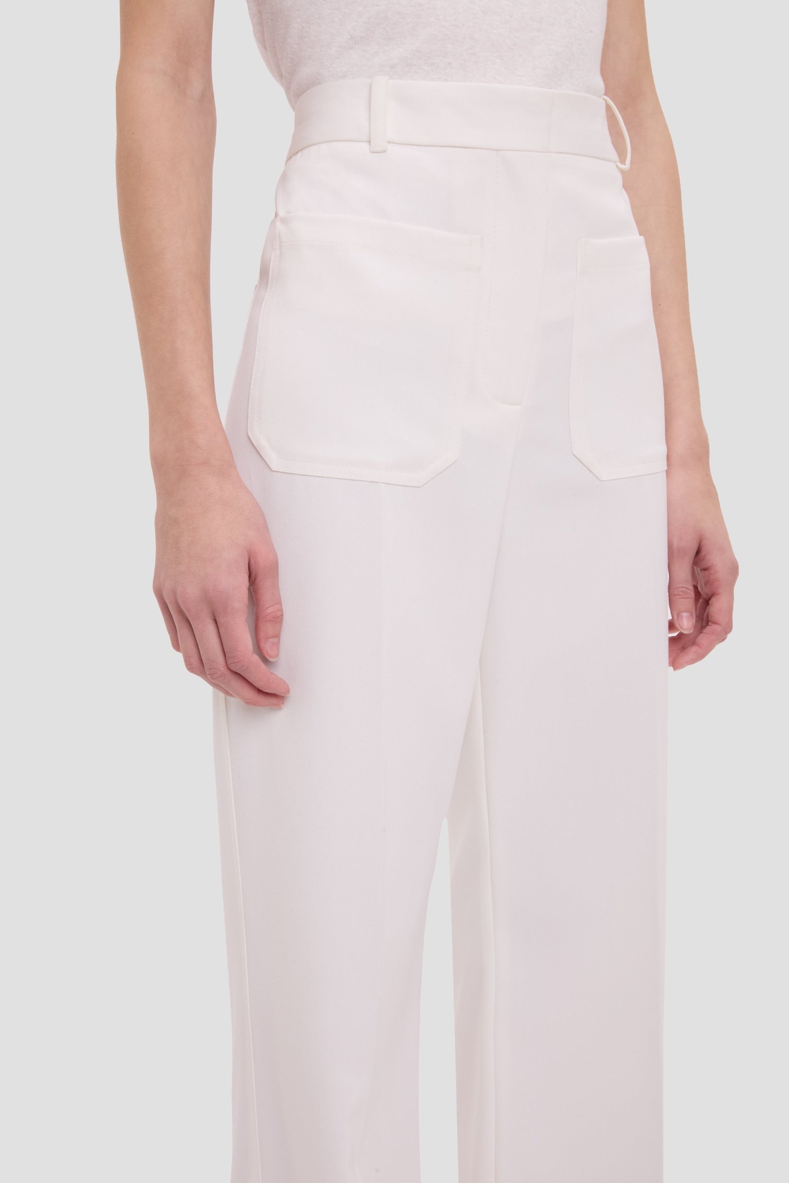 Фирменные штаны Alina представлены в новом сезоне из шерстяной смеси цвета слоновой кости. Они имеют высокую талию, широкие штанины и длинную длину для выгодного силуэта, а пояс из той же ткани удлиняет фигуру. Шлевки для ремня и накладные карманы дополняют образ.