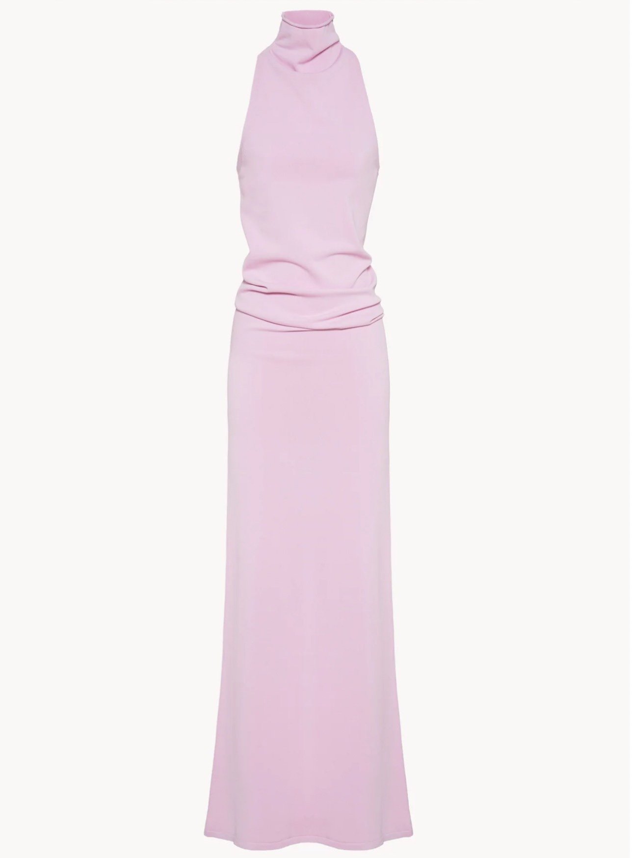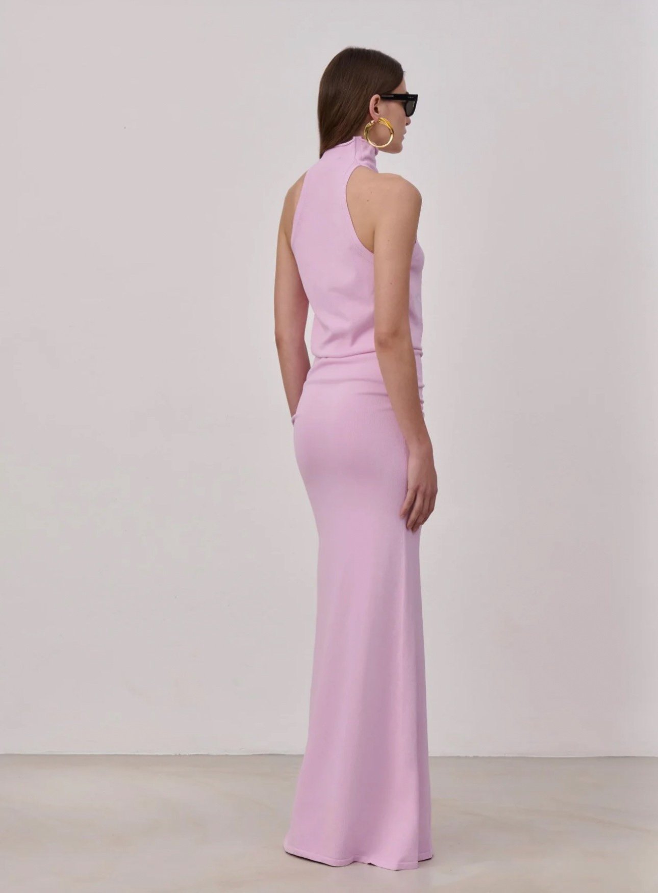 Длинное трикотажное платье из вискозы и нейлона с воротником-кратером. Воронковидная форма платья облегает бедра, сохраняя при этом свободный крой в верхней части. Без подложки.