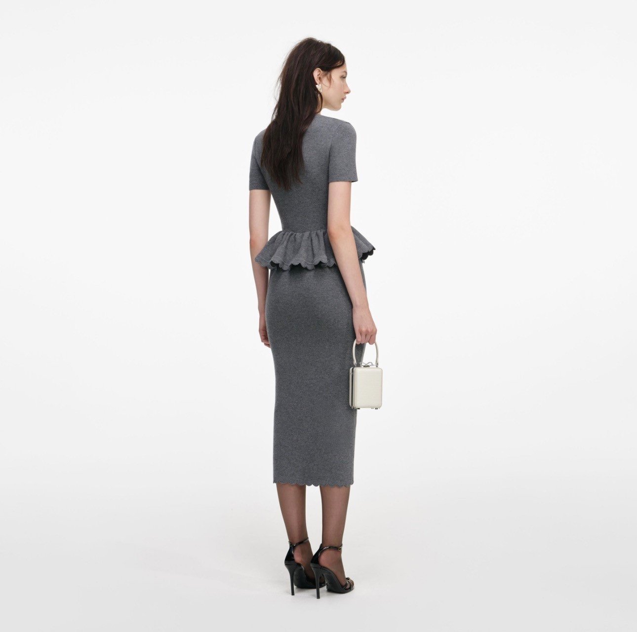 Мягкое и изящное, это серое платье меди изготовлено из хлопкового кашемира для непревзойденного вида. Элегантная баска и фестончатая отделка подчеркивают силуэт над полированной карандашной юбкой. см, размер S