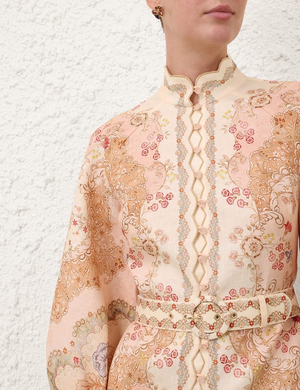 Льняное мини-платье с воротником-стойкой, застежкой-рулео посредине спереди и длинными рукавами-разрезами, съемным поясом на талии и скрытой блеском сзади.