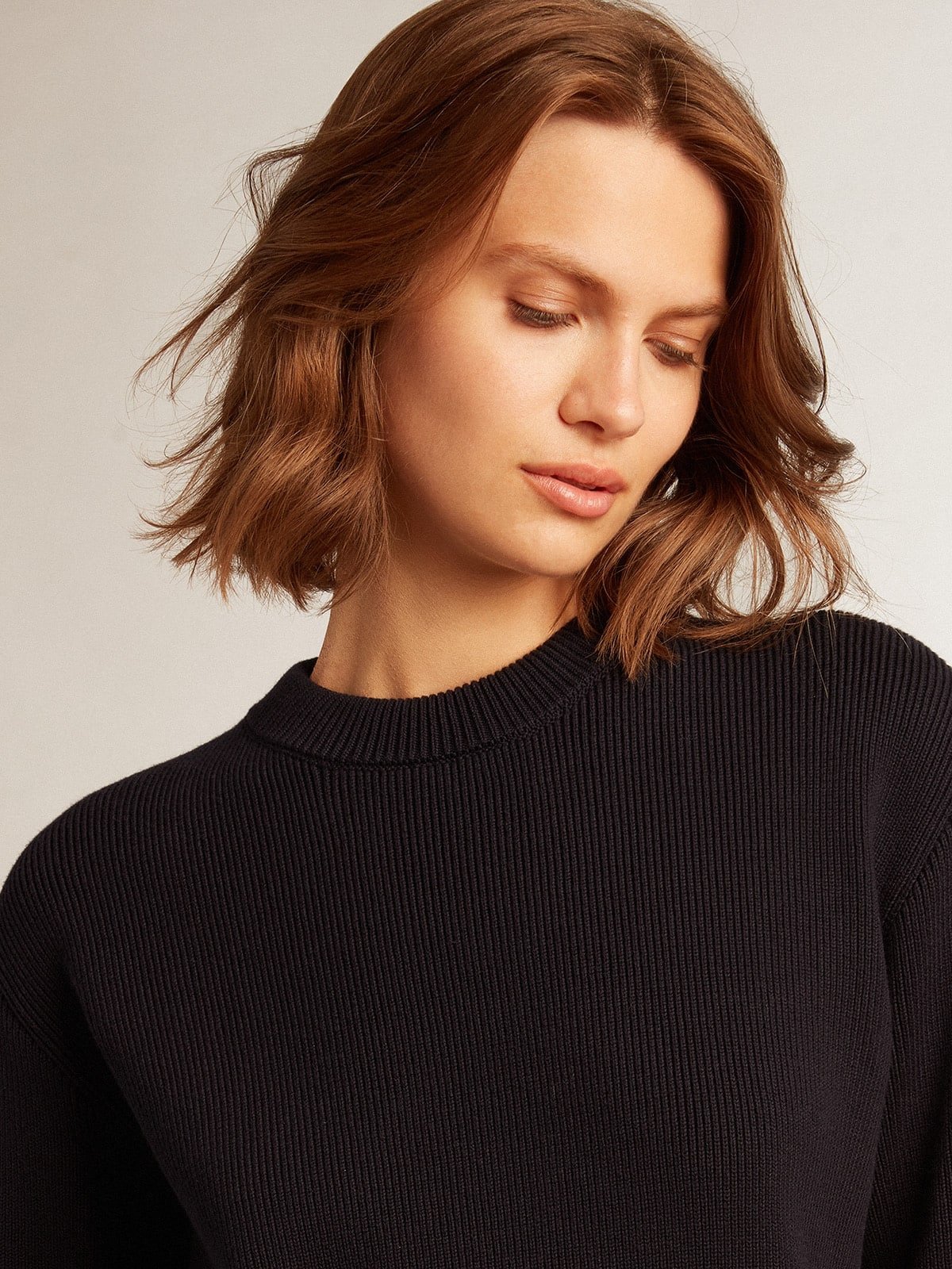 Этот женский свитер с круглым воротником-синим хлопковым вырезом имеет контрастный белый логотип на спине.