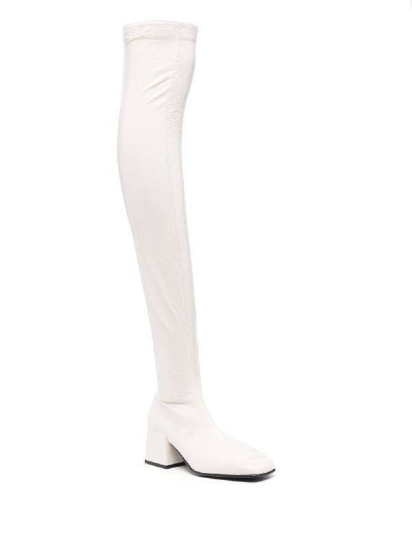 Логотип у тон, модель без застібки, висота до лінії стегна, квадратний носок та низький блоковий каблук.
