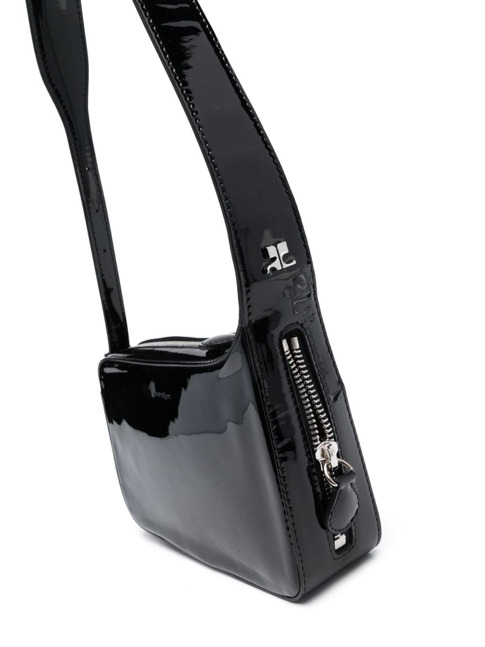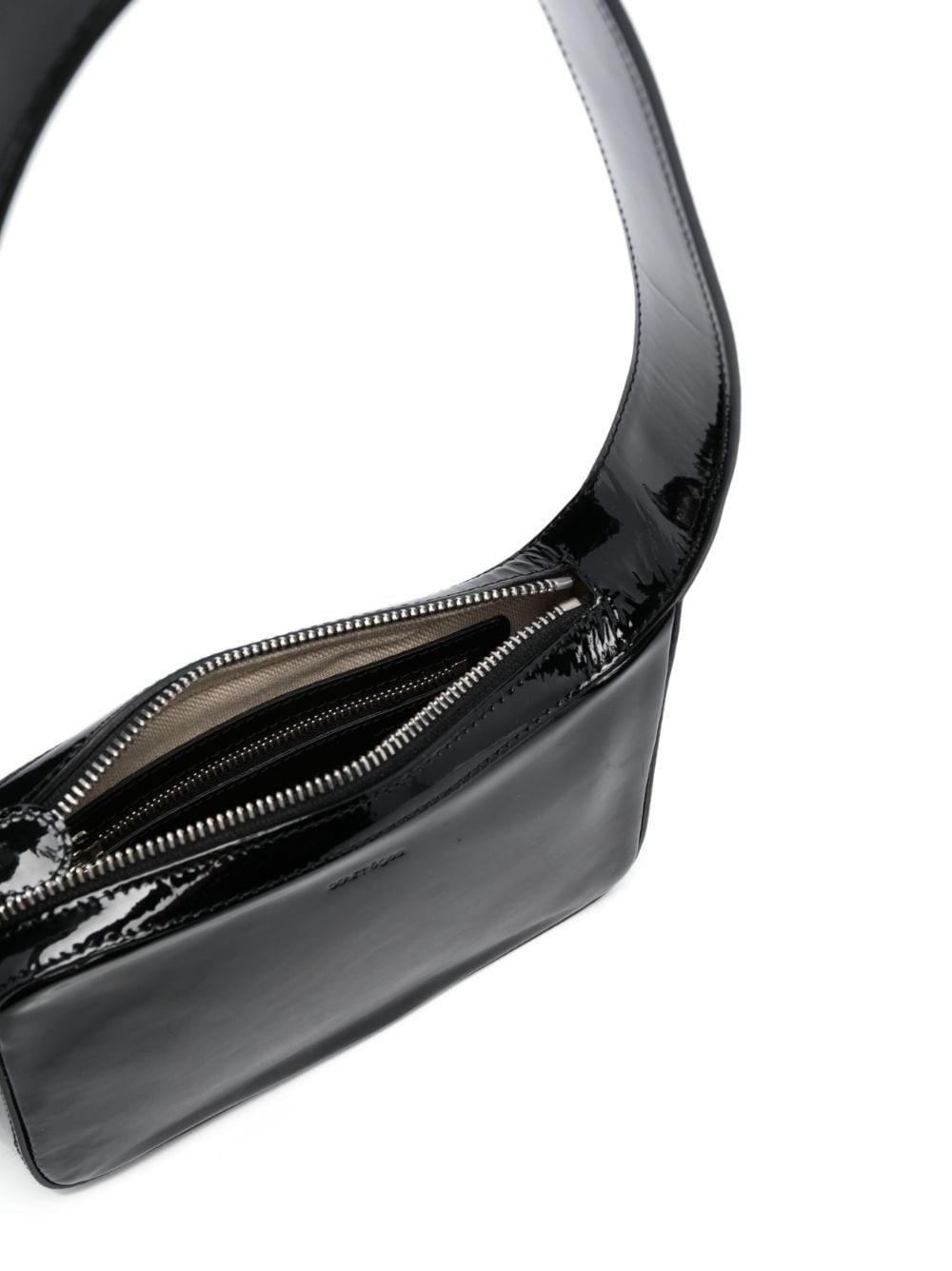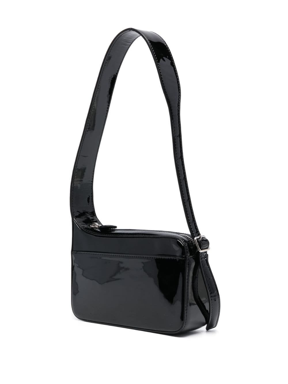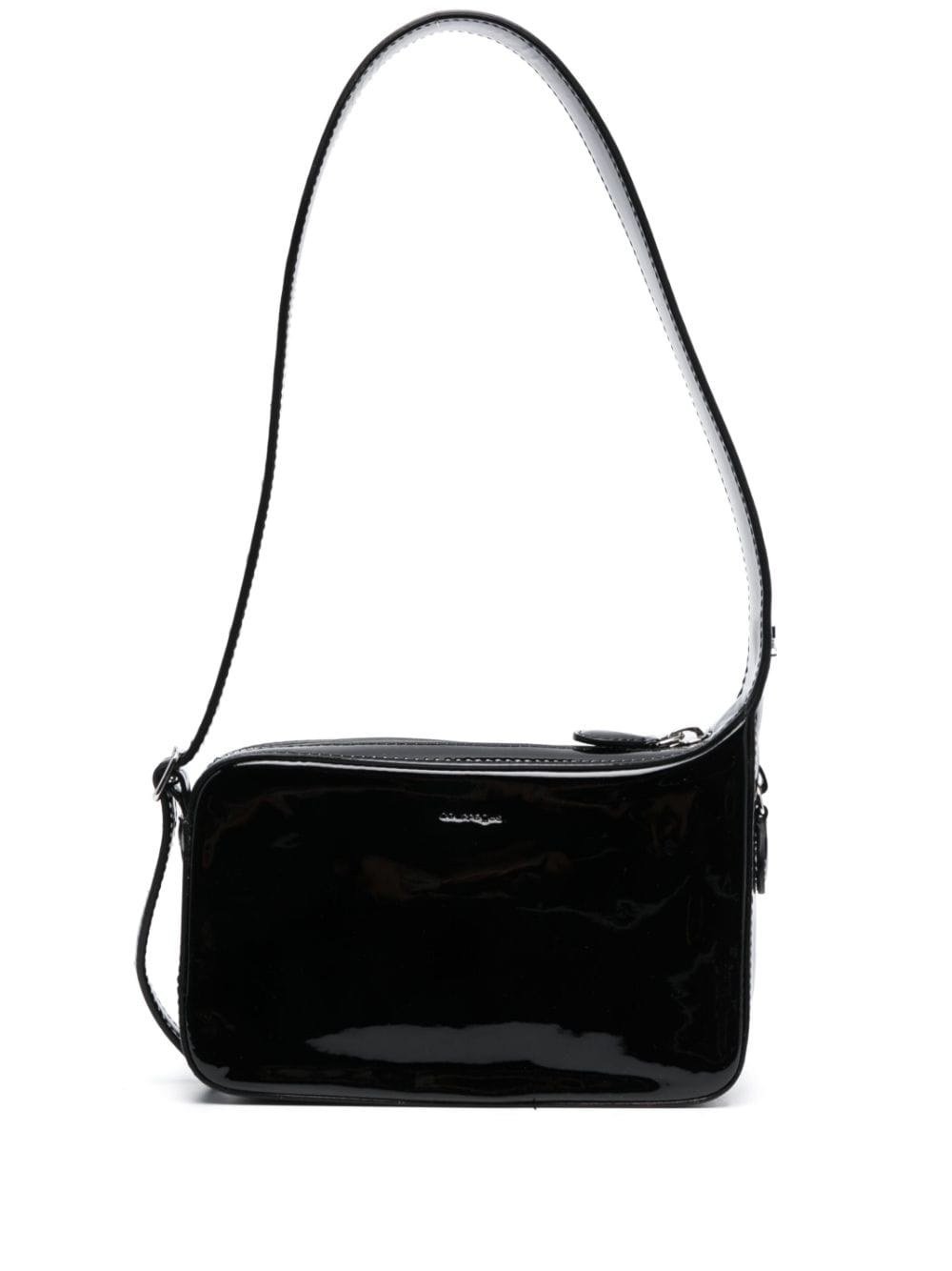 Чорний, теляча шкіра, лакована обробка, підкладка з бавовни, вигравіруваний логотип, дві кишені на блискавці з боків, регульований ремінь на плече, застібка на блискавці зверху, основне відділення та внутрішня кишеня на блискавці.