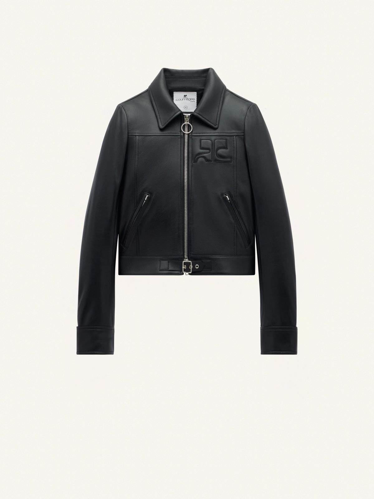 Шкіряна куртка прямої форми. Має велику блискавку спереду, дві кишені на блискавці та пряжку на талії.