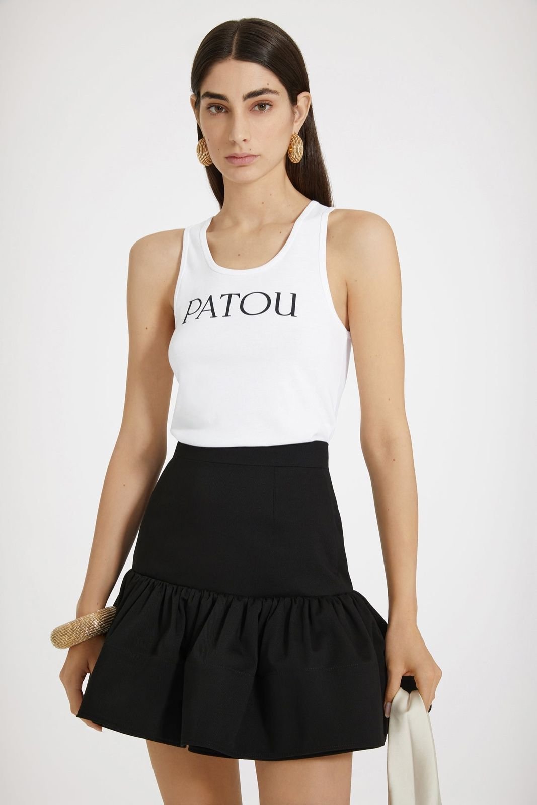 Чорна бавовняна спідниця з габардину. Висока талія. Коротка довжина. Кльош силуету з високим воланом на подолі. Застібка на блискавку ззаду. Дартс спереду і ззаду.