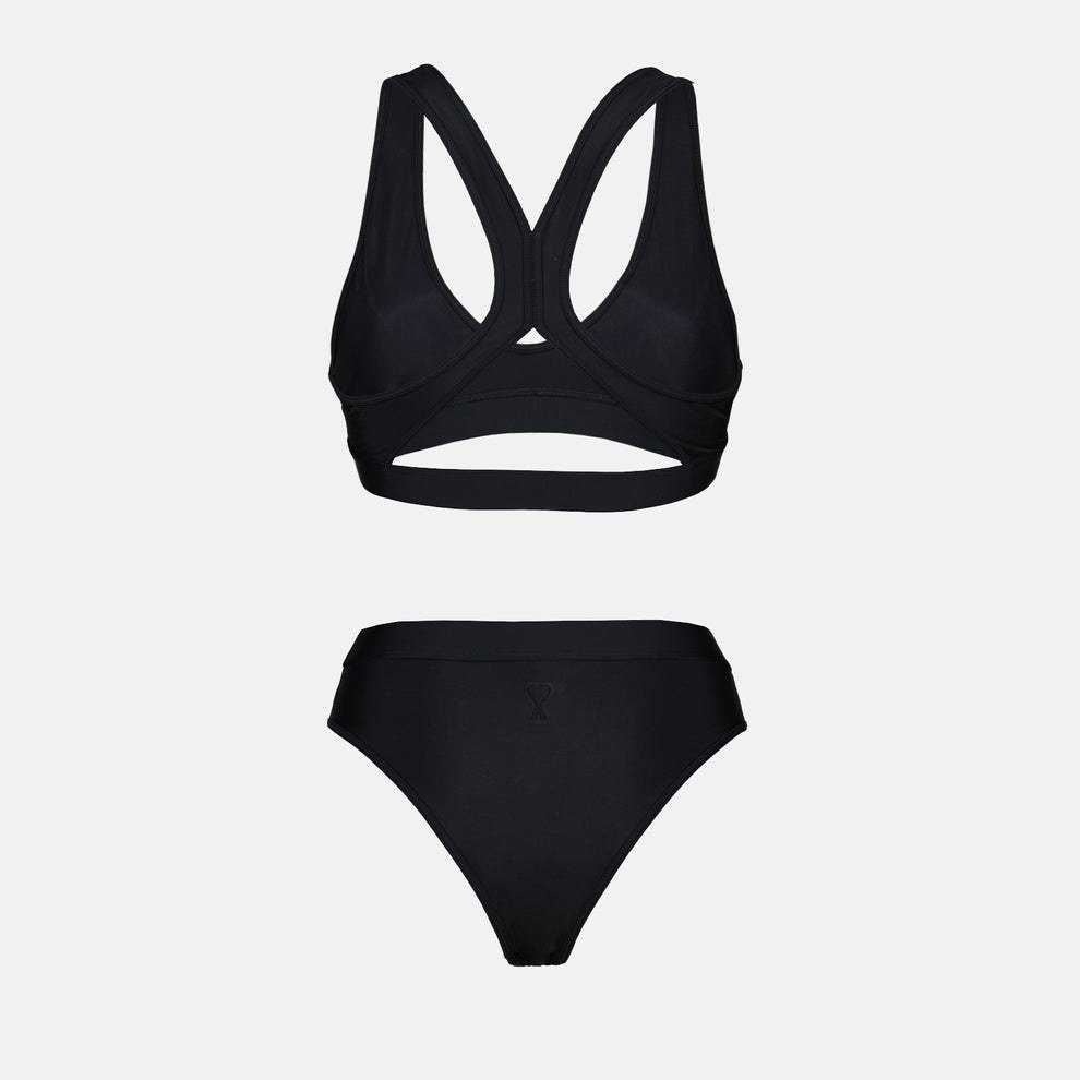 Опис: Округлий виріз горловини. Тонкі бретелі. Високий виріз. Тон-в-тон логотип Ami de coeur. Однотонний колір. Завищена талія. Гонкова спинка.
