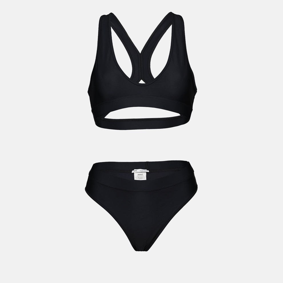 Опис: Округлий виріз горловини. Тонкі бретелі. Високий виріз. Тон-в-тон логотип Ami de coeur. Однотонний колір. Завищена талія. Гонкова спинка.