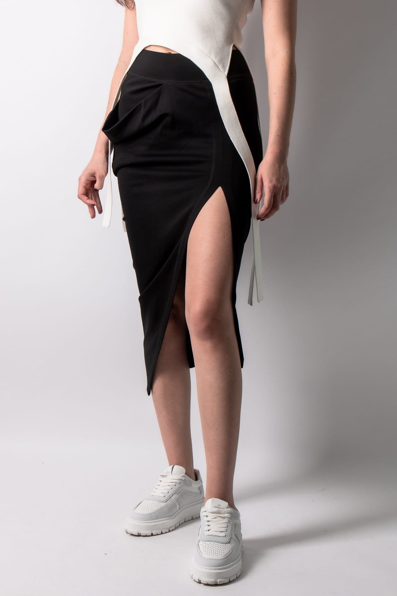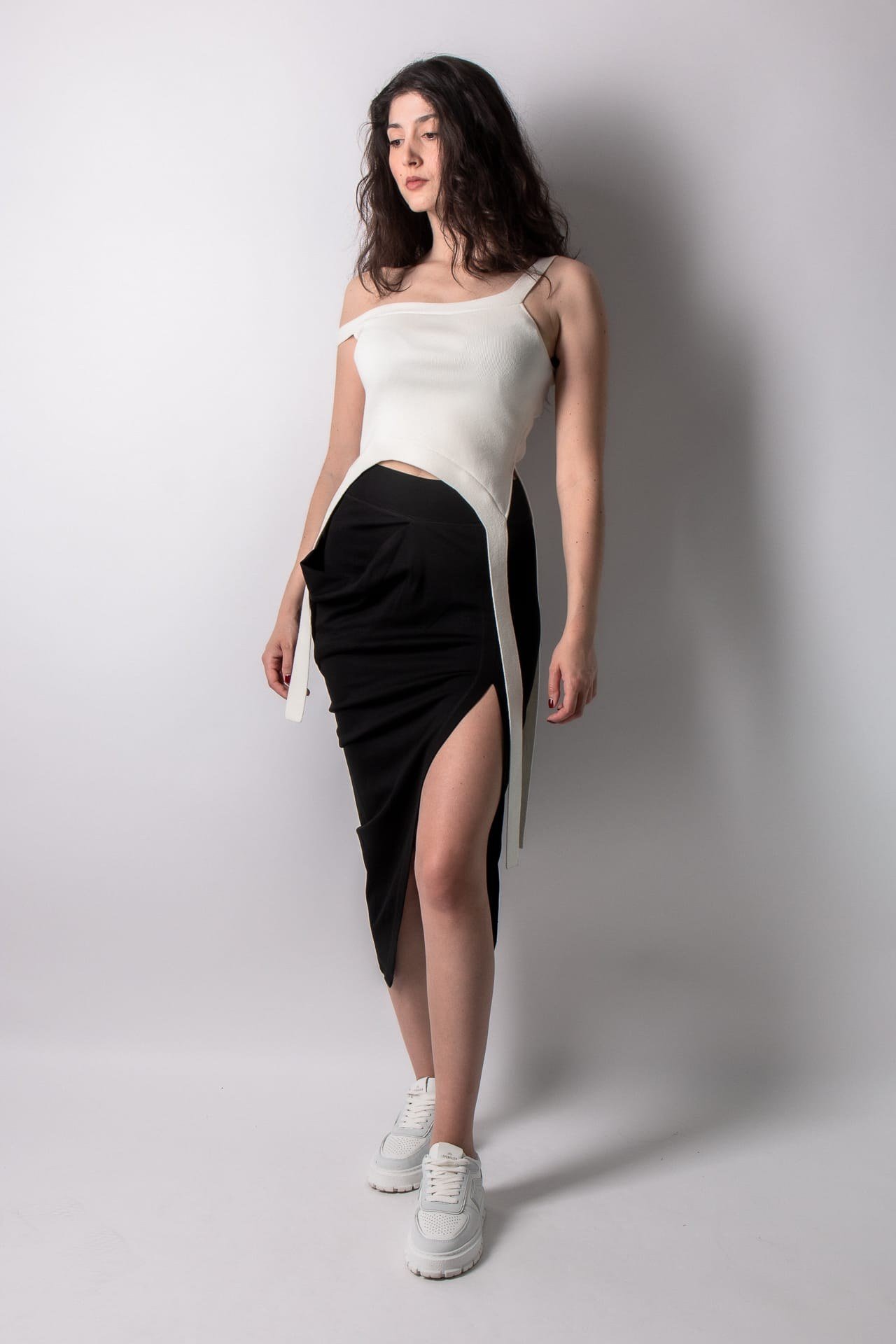 Опис: Асиметрична спідниця міді з суміші віскози. Унікальний дизайн, який вражає особливою драпіруванням. Асиметричний стиль надає спідниці динамічності та нетрадиційної естетики. Силует, що облягає фігуру. Струмуюча, елегантна драпірування тканини. Висока талія. Високий розріз на спині особливо підкреслює фігуру. Модний вираз, який підходить як для урочистих випадків, так і для вуличного образу. Звичайна посадка.