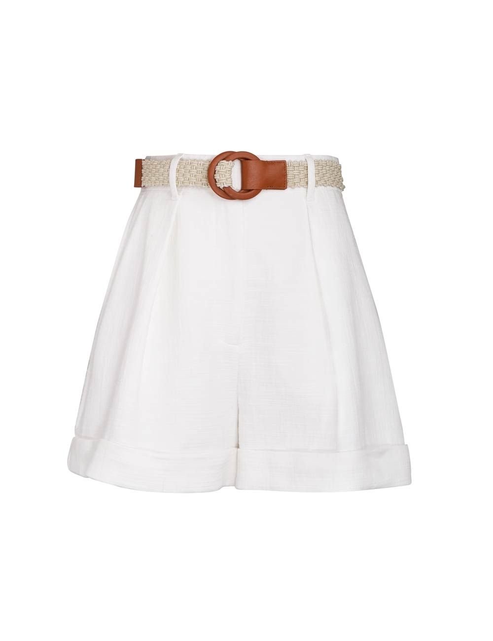 Шорти із завищеною талією, фіксованими закрученими манжетами та підкладками по центру спереду. Знімний пояс.