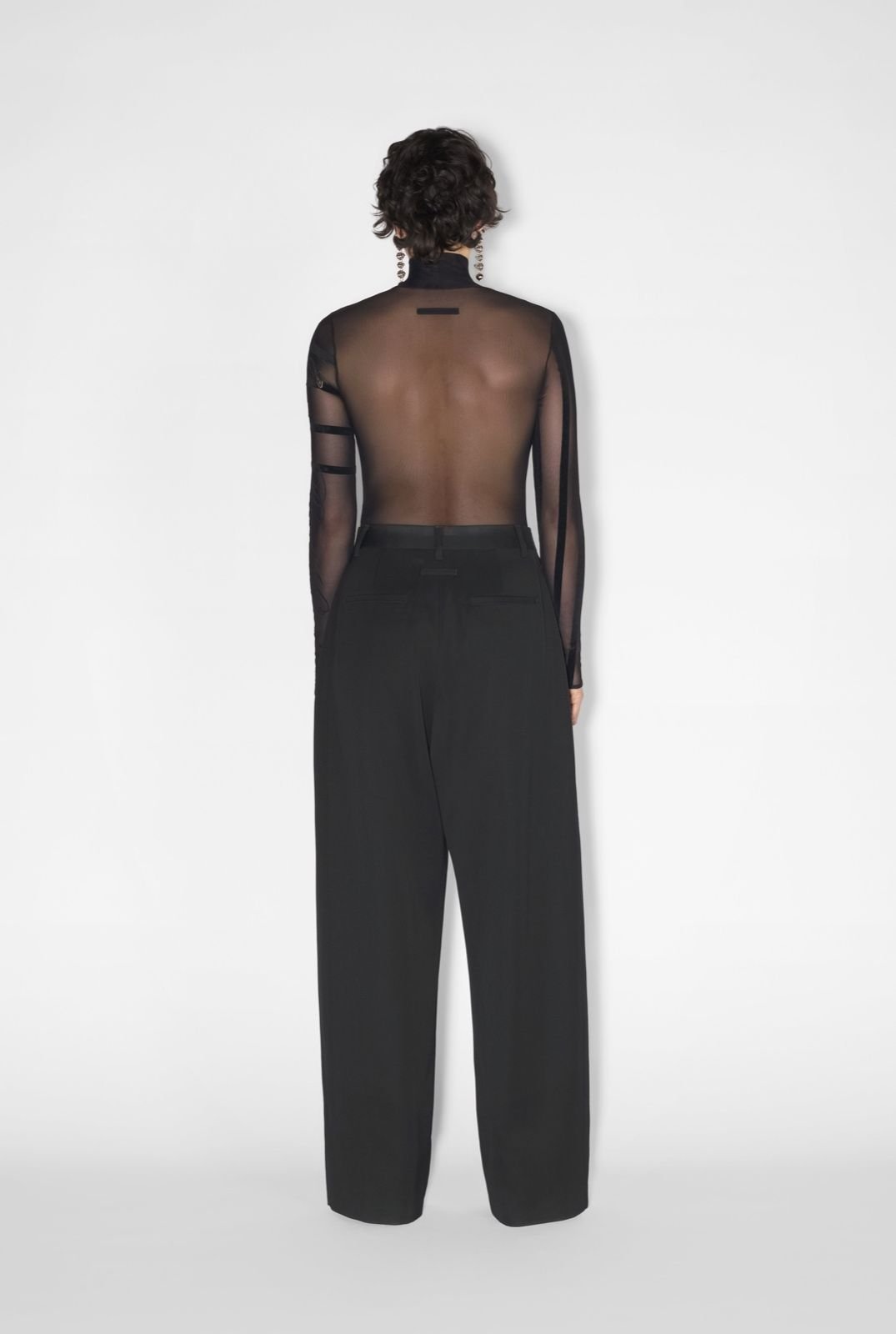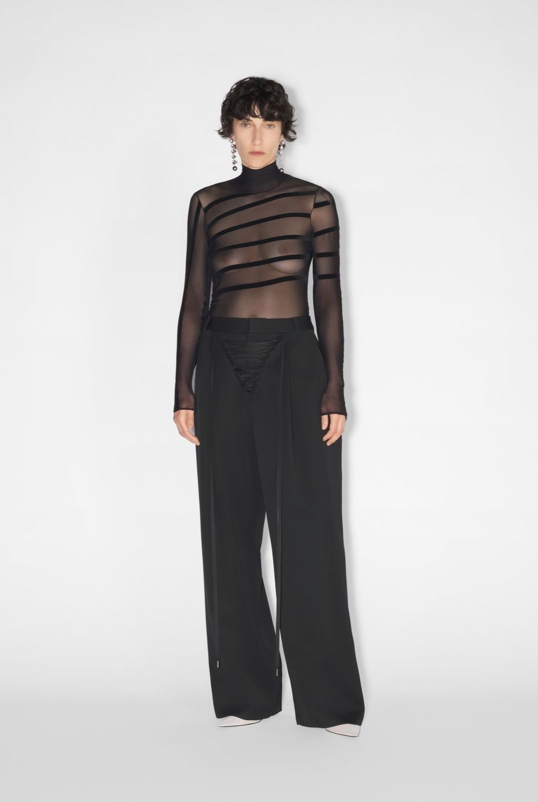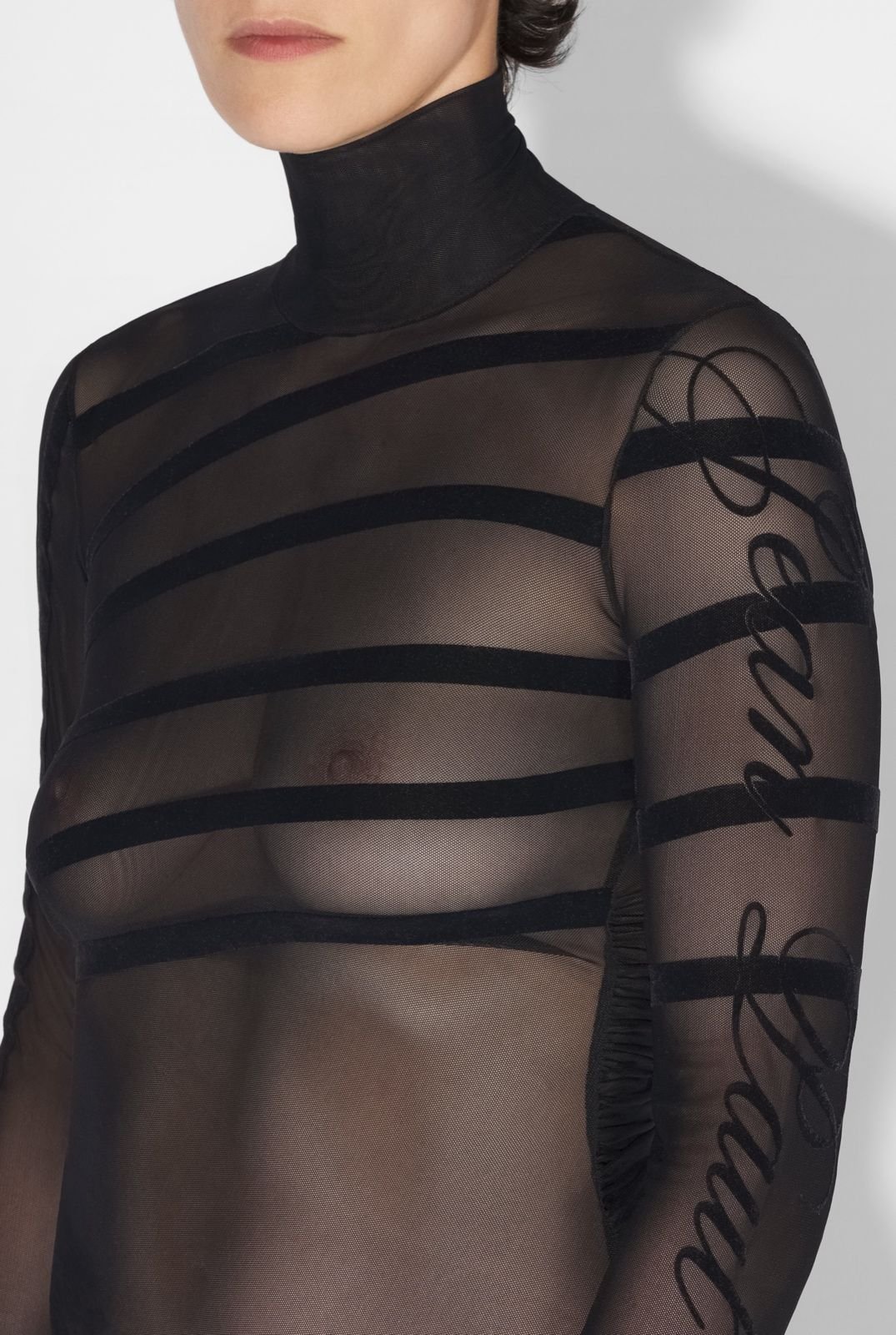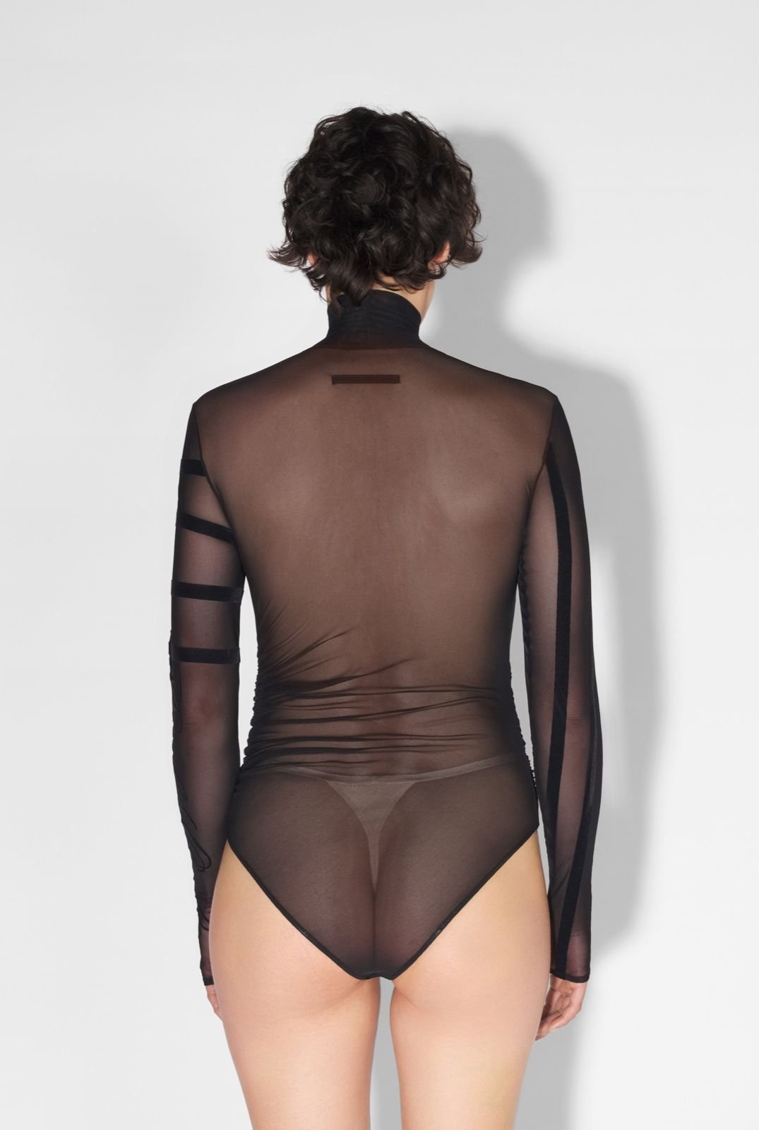 Чорне тюлеве боді з довгими рукавами з деталями Marinière і флокованим оксамитовим логотипом Jean Paul Gaultier