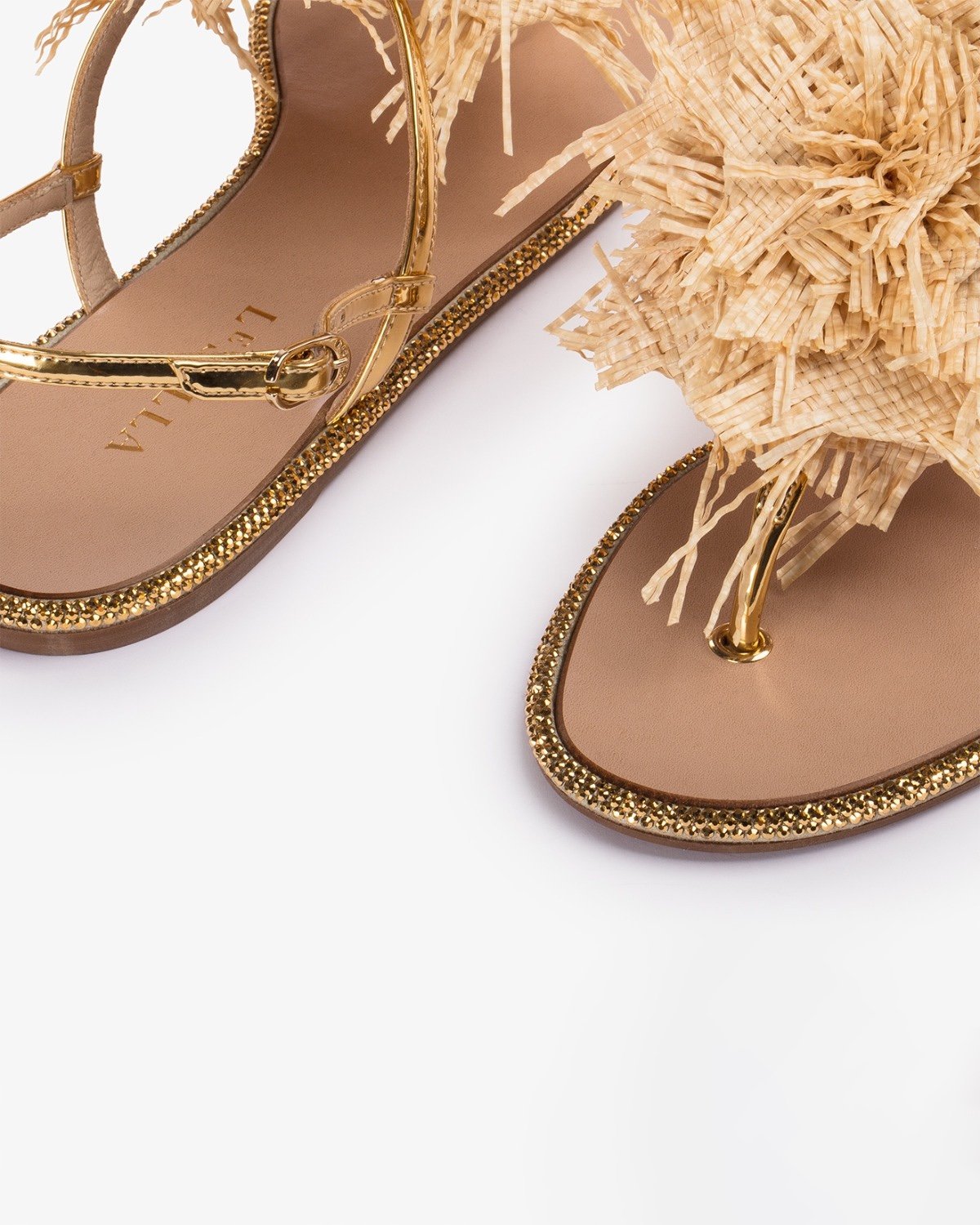 Сандалі Rose від Le Silla – це розкішні плоскі капці, виготовлені вручну в Італії з бежевою рафією. Верх прикрашений декором у формі троянди, що виражає жіночність та ніжність, підкреслюючи природну бахрому матеріалу. Краї з матеріалу з ефектом кришталевого паве додають яскравості моделі, ідеально підходять як для денного, так і для вечірнього носіння. М'яка підкладка з наппи забезпечує комфорт, а шкіряна підошва товщиною 15 мм забезпечує стабільність та довговічність.