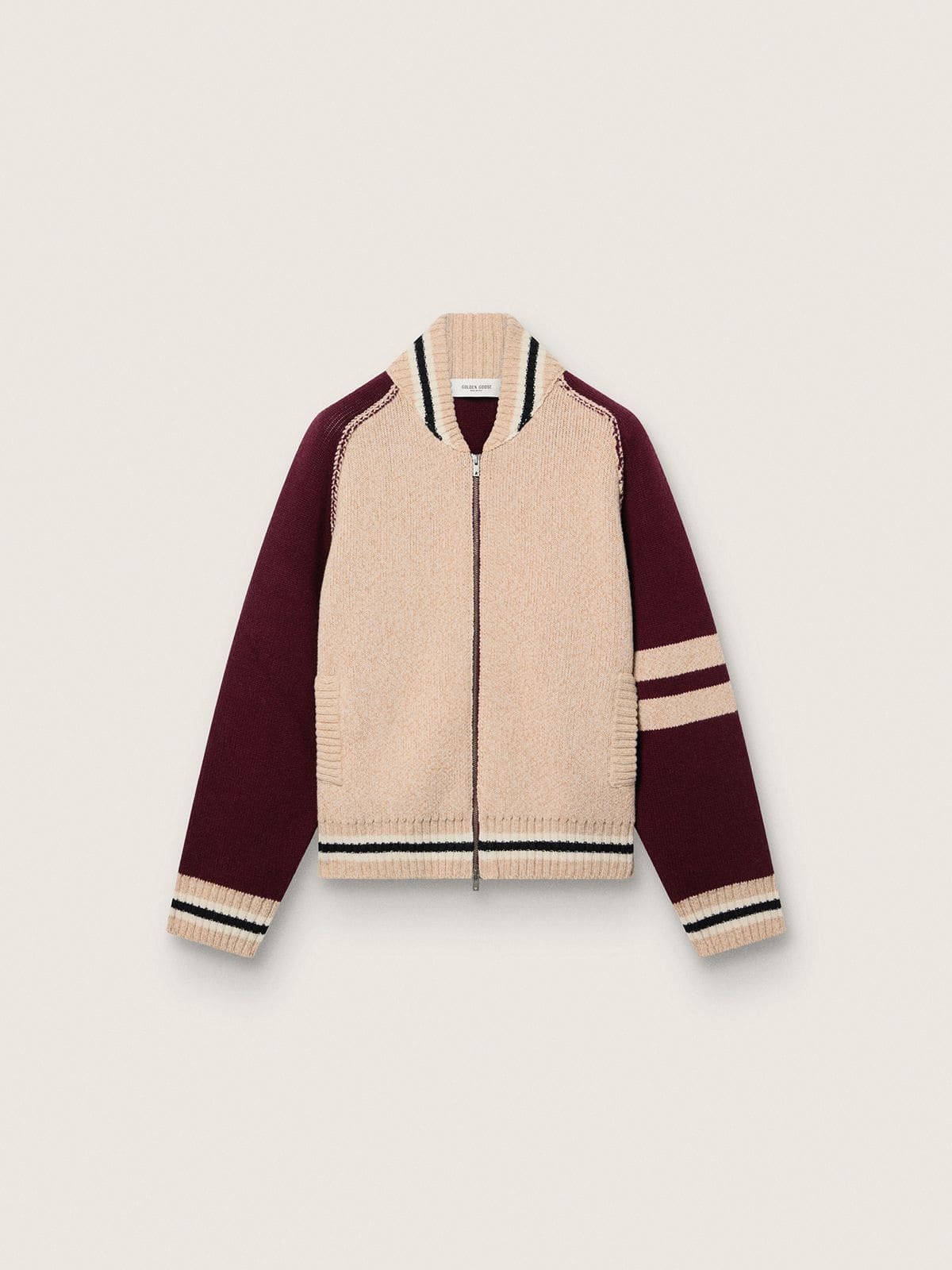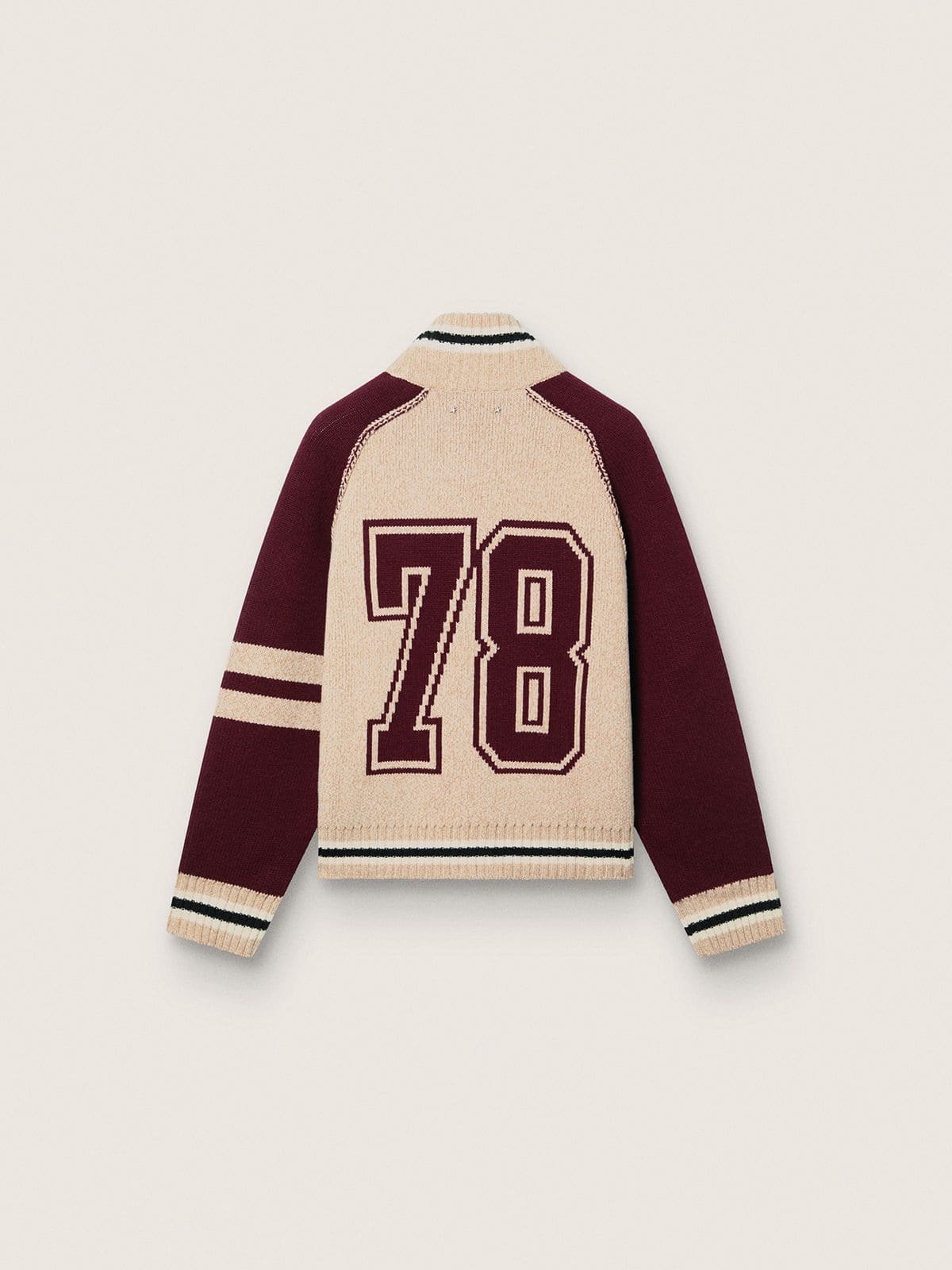 Ефектний виріб у ретро-стилі: ця унісекс-куртка-бомбер звичайного крою виготовлена з пряжі з додаванням вовни у відтінках білого та бордового.
