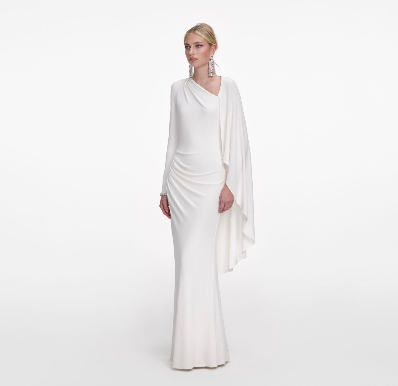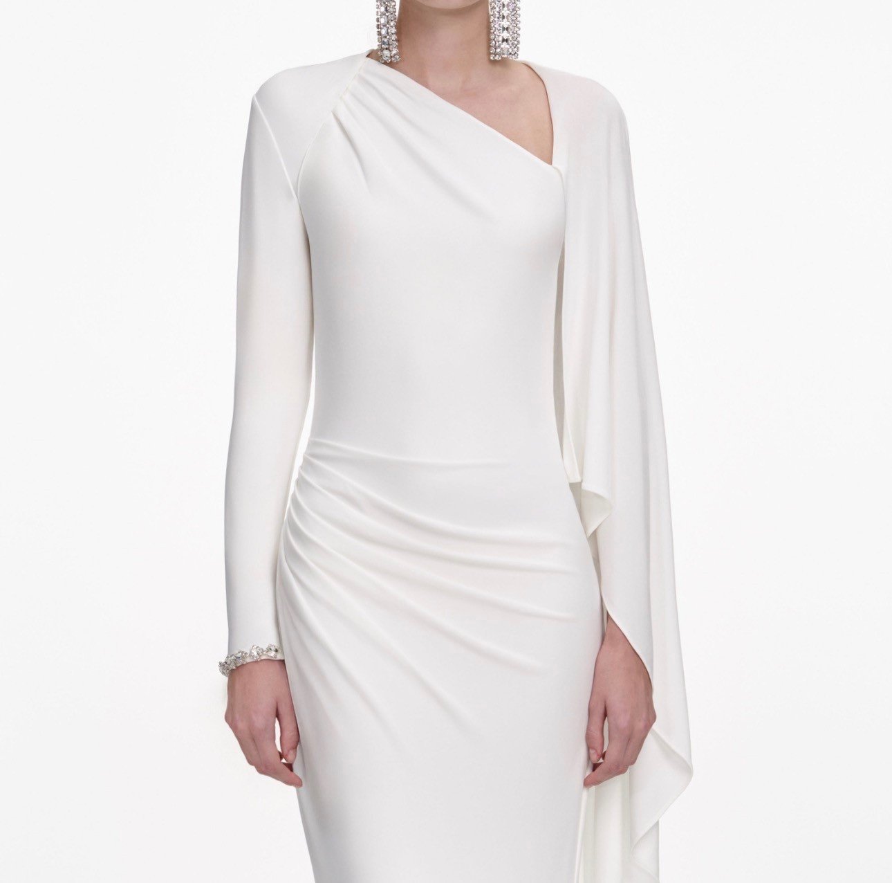 Ідеально витончена, авангардна драпіровка поєднується зі сміливою асиметрією в цій білій трикотажній сукні максі. Її виріз витончено переходить у динамічний накидний елемент – додайте підбори для незабутнього входу.