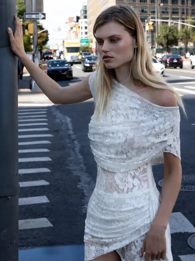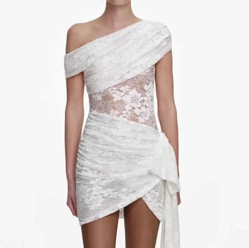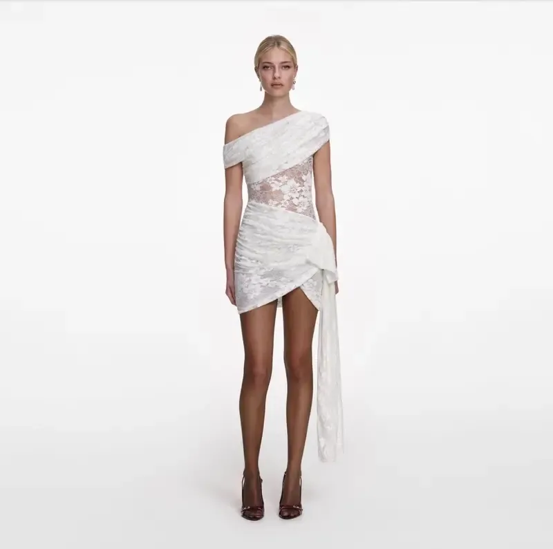 Вінтажні акценти та плавне драпірування поєднуються з неперевершеним блиском у цій міні-сукні в горошок. Виготовлена з мережива, прикрашеного стразами, та доповнена туфлями на шпильці, щоб підкреслити привабливий бантик.