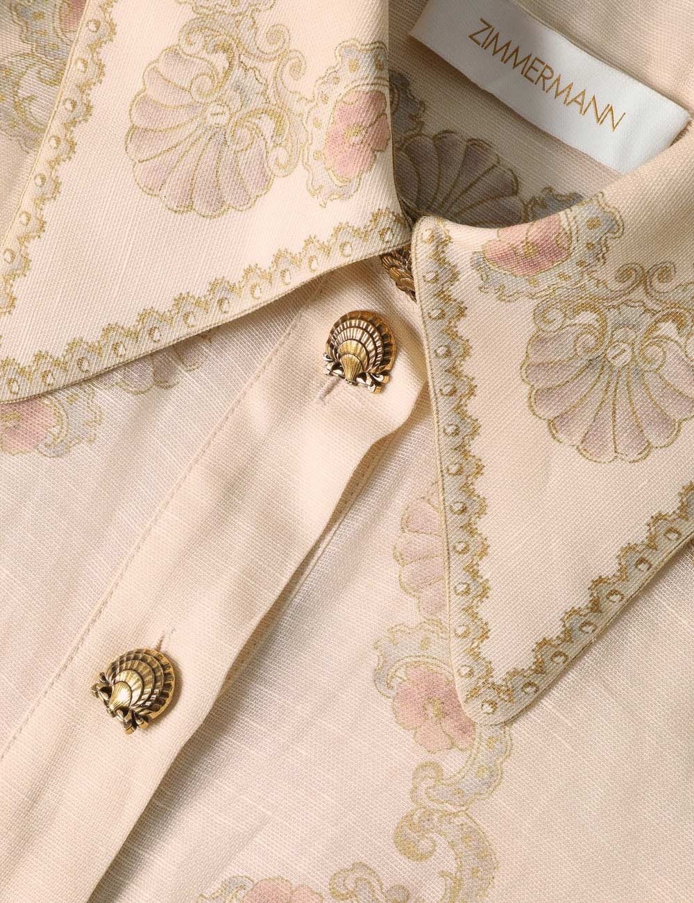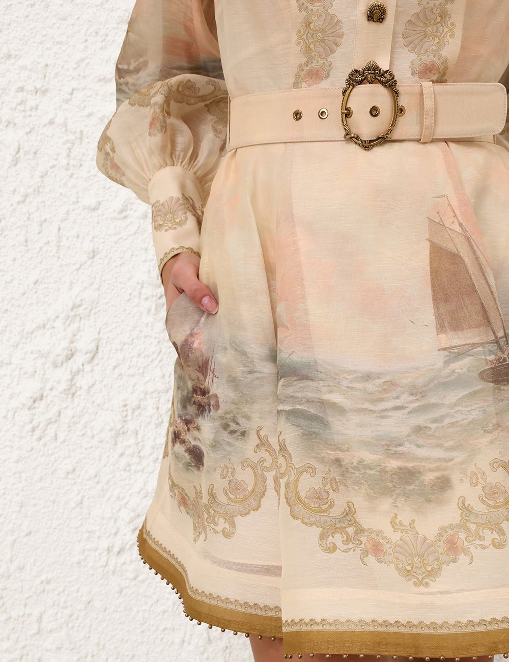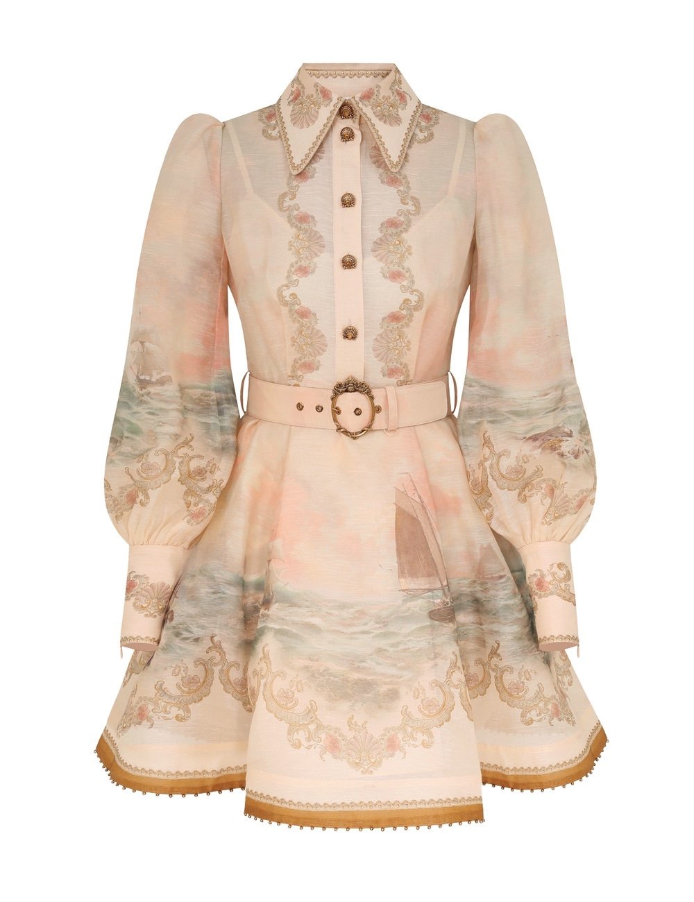 Міні-сукня з шовку та льону з класичним коміром, функціональними ґудзиками посередині спереду, знімним поясом на талії та повністю розкльошеною спідницею.